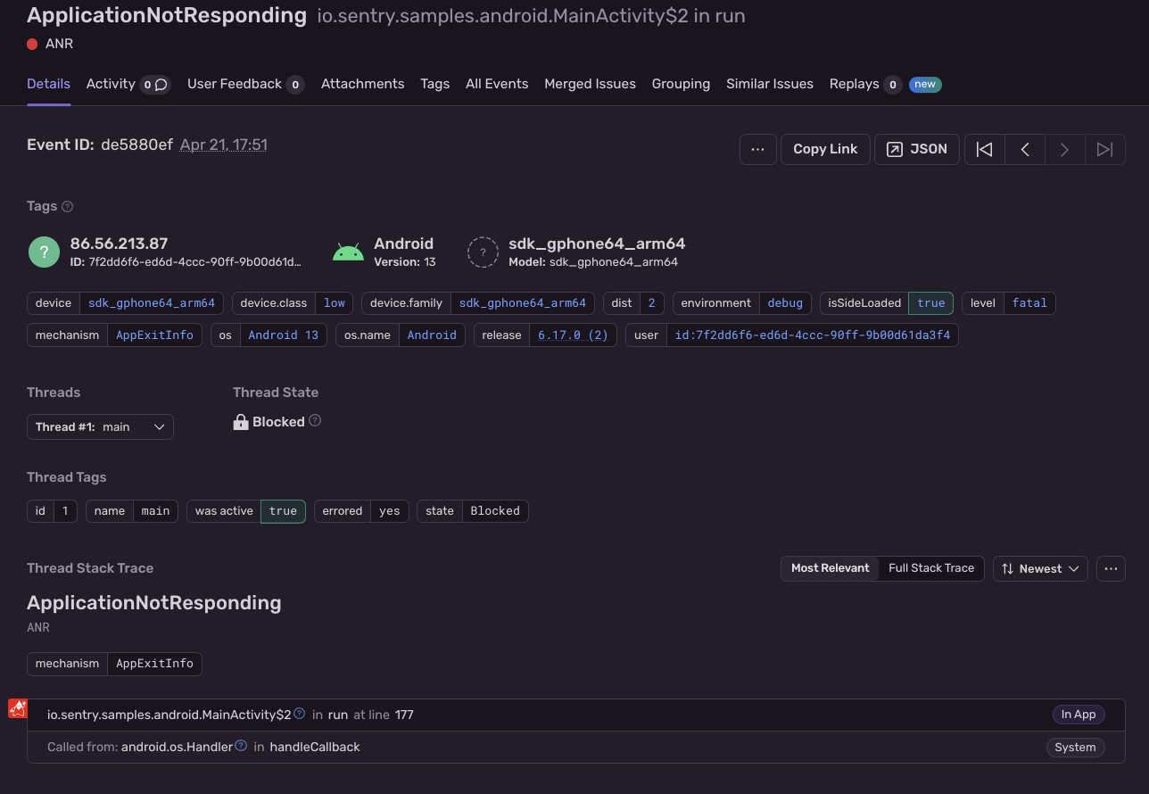 If an ANR is connected to one of the Performance Issues detected by Sentry (for example, File I/O on Main Thread or DB on Main Thread), the offending span will be linked to the ANR event, showing you exactly which slow operation is to blame.